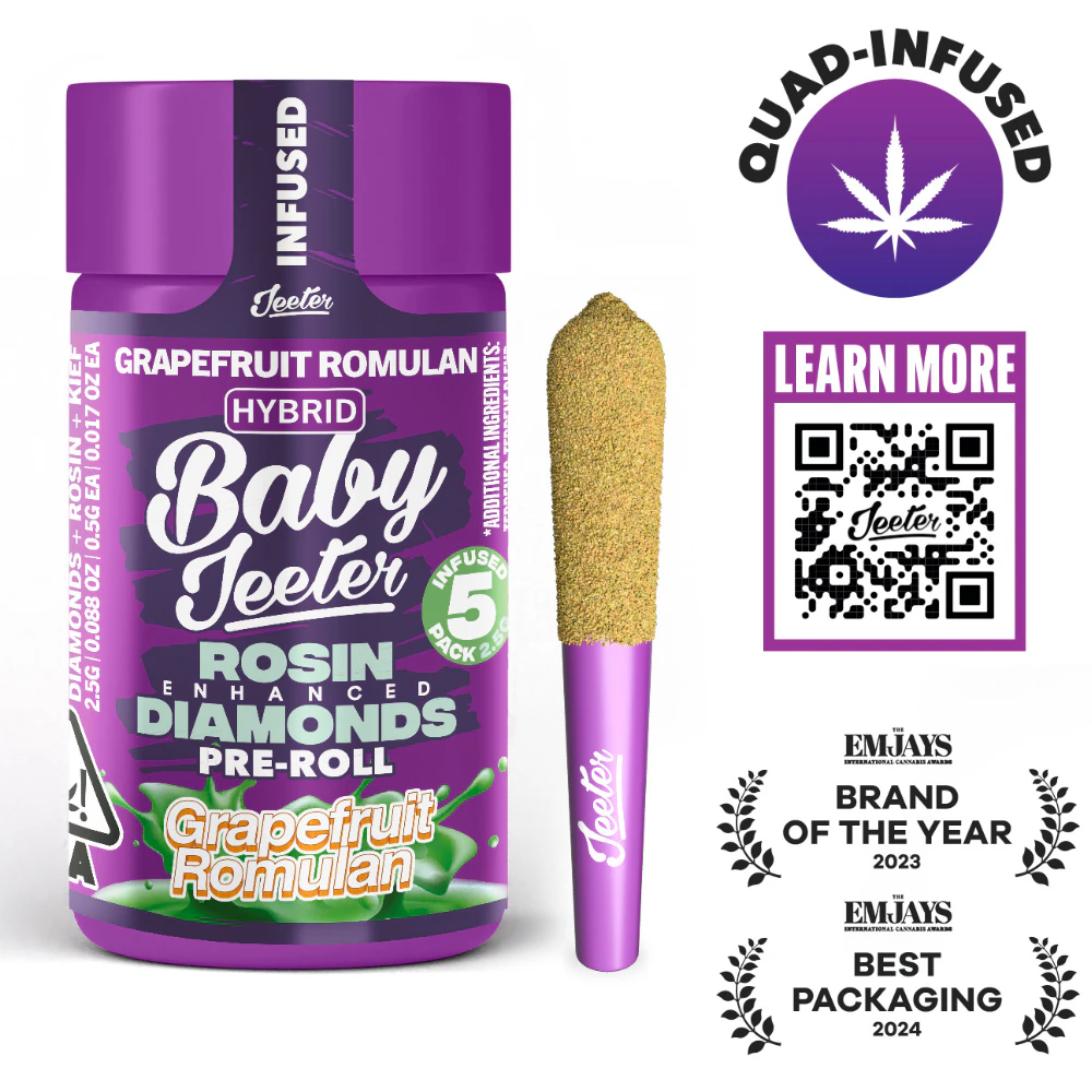 Baby Jeeter. Pocket-sized vibes. In each jar, you'll find a hand crafted, hand rolled 5 0.5-gram Jeeter joints. They're made with premium indoor grown flower, infused with Liquid Diamonds in California and Michigan or distillate oil in Arizona, and dusted in kief. 5-minute burn time each. Our 5 pack of Baby Jeeters is great for sharing with friends...or not. We won't judge.