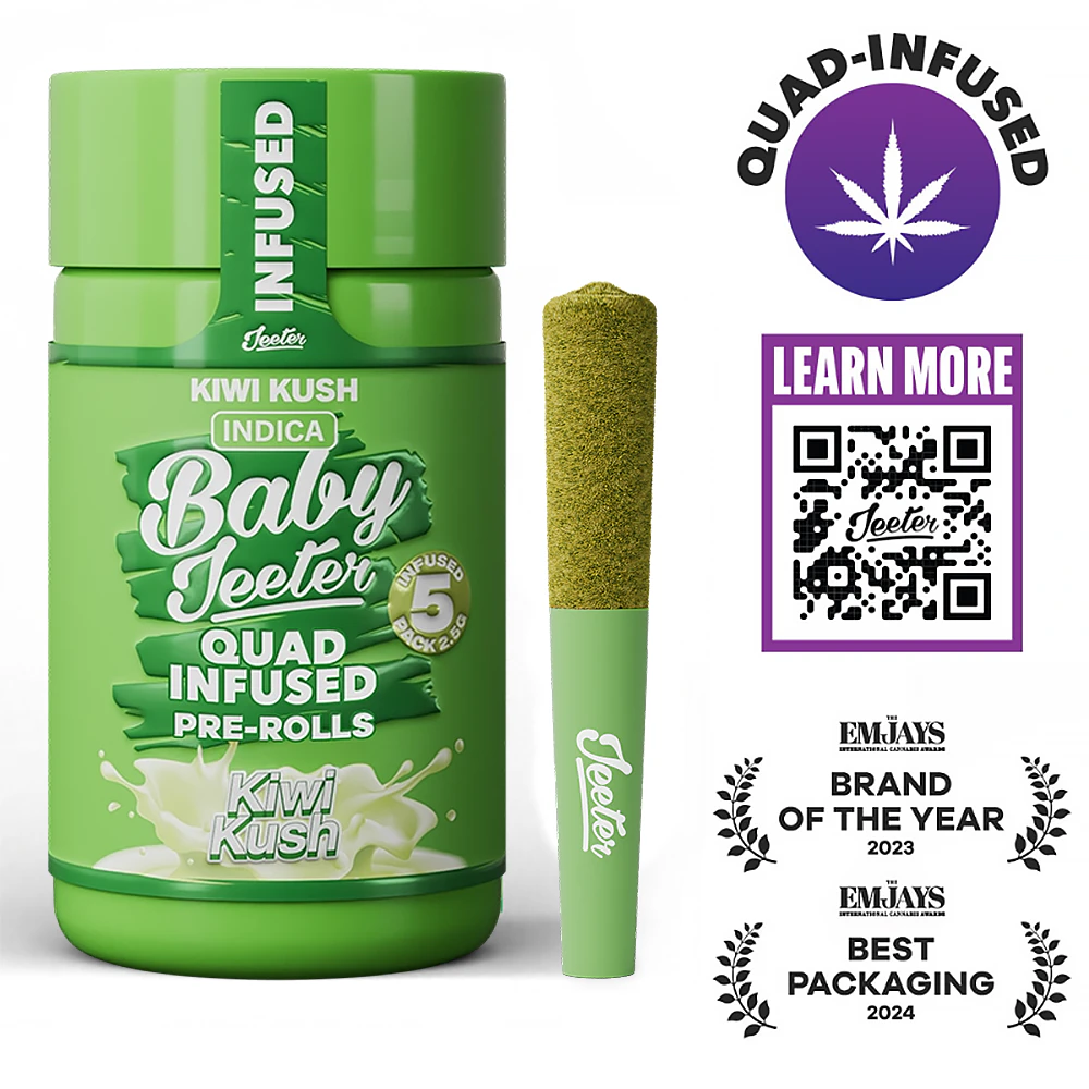 Baby Jeeter. Pocket-sized vibes. In each jar, you'll find a hand crafted, hand rolled 5 0.5-gram Jeeter joints. They're made with premium indoor grown flower, infused with Liquid Diamonds in California and Michigan or distillate oil in Arizona, and dusted in kief. 5-minute burn time each. Our 5 pack of Baby Jeeters is great for sharing with friends...or not. We won't judge.