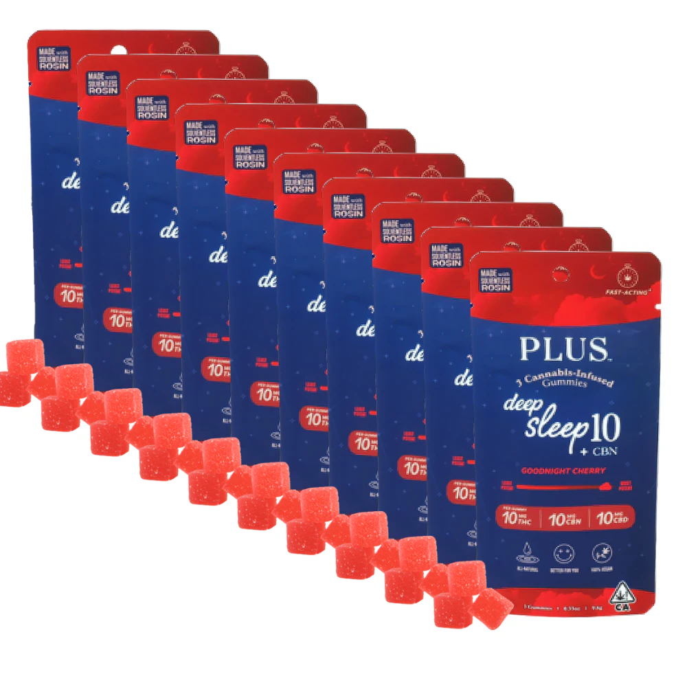 This Bundle includes 10 of the 3-Pack (30mg). | The Heavyweight Champ of Sleep Gummies. Deep Sleep Goodnight Cherry gummies deliver the ultimate trifecta for a rejuvenating night's rest. Each gummy packs 10mg THC, 10mg CBD, and 10mg CBN, making it our most potent sleep solution. With a rich cherry flavor and powerful formula, these gummies are designed to help you drift off effortlessly and stay deeply asleep. 3 servings per pack (30mg THC/30mg CBD/30mg CBN). Rest Easy with PLUS Sleep Gummies. Formulated to help you fall asleep faster, stay asleep longer, and wake up feeling refreshed, these vegan gummies are your perfect nighttime companion. Made with all-natural colors and flavors, PLUS Sleep Gummies blend nano-emulsified THC with calming CBN, CBD, and soothing terpenes to deliver a restful and rejuvenating experience.