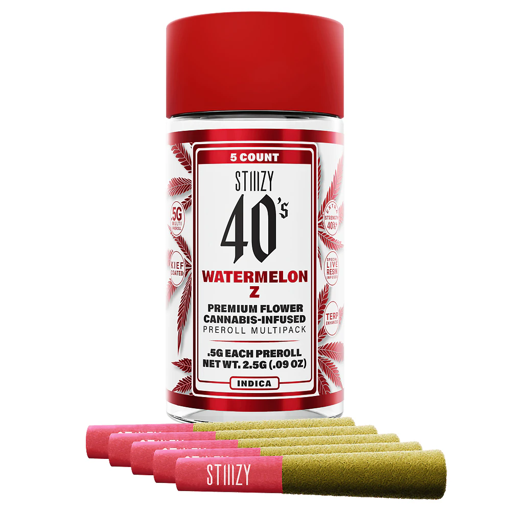 STIIIZY 40's pre-rolls are setting the standard with high potency, cannabis infused joints coated evenly with kief. Using their proprietary live resin infusion methods, STIIIZY designed every pre-roll to offer 40%+ THC potency with a unique flavor profile. With a smooth inhale and tasteful exhale, each and every STIIIZY 40's is packed with indoor grown flower, specifically made to ensure a potent and long-lasting high. Spark up the 40's.